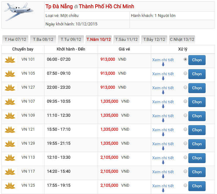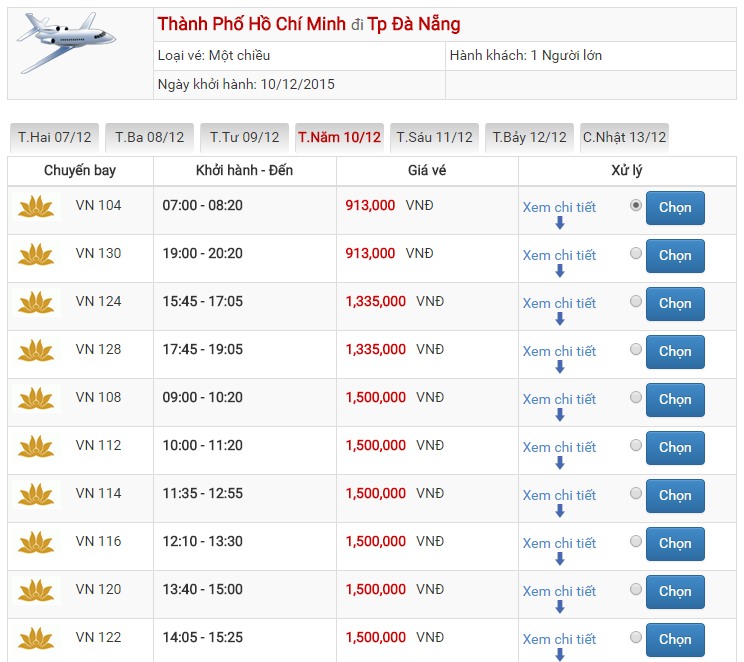 1. Cập nhật bảng vé máy bay đi Đà Nẵng Sài Gòn của Vietnam Airlines