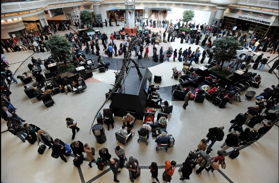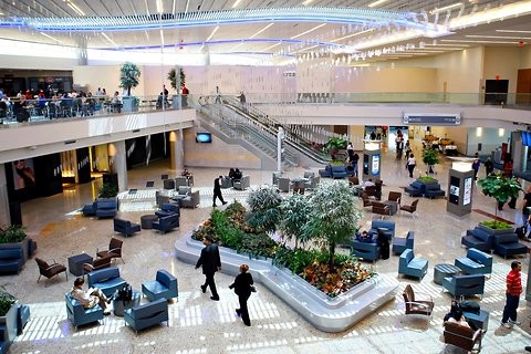 Khung cảnh một nhà ga quốc tế, gồm phòng chờ, tại phi trường Atlanta. Sở dĩ Atlanta trở thành sân bay đông đúc nhất thế giới bởi đây là trung tâm của các chuyến bay nội địa và chuyến bay tới châu Âu hay Nam Mỹ.