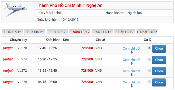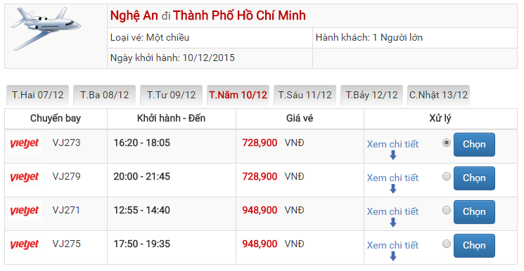 1. Cập nhật bảng vé máy bay đi Vinh Sài Gòn của VietJet Air